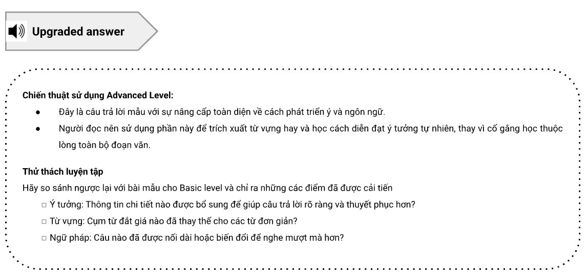 Bài viết sau đây sẽ cung cấp các câu trả lời mẫu theo khung sườn tư duy (Simple Answer) cùng các thử thách nâng cấp (Upgraded Answer) về cả ý tưởng, từ vựng và ngữ pháp để người học lựa chọn được câu trả lời phù hợp với bản thân, sẵn sàng cho các tình huống trong phòng thi. Bài phân tích này sẽ dẫn dắt người học đi qua các câu trả lời mẫu IELTS Speaking Part 1 cho chủ đề Working with Older People, từ những thành ngữ miêu tả sự hướng dẫn trong công việc như 'show me the ropes' đến các cụm từ diễn đạt giá trị của kinh nghiệm sống như 'practical advice' hay 'life lessons', giúp người học chinh phục giám khảo bằng sự mạch lạc và ngôn ngữ tự nhiên.