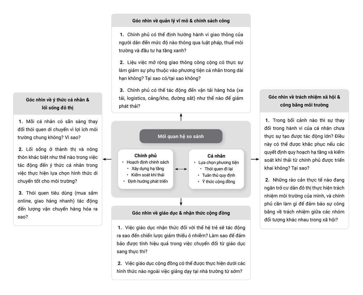 B. Mở rộng góc nhìn - Thảo luận về việc chịu trách nhiệm về ô nhiễm do giao thông đến các vấn đề xã hội khác