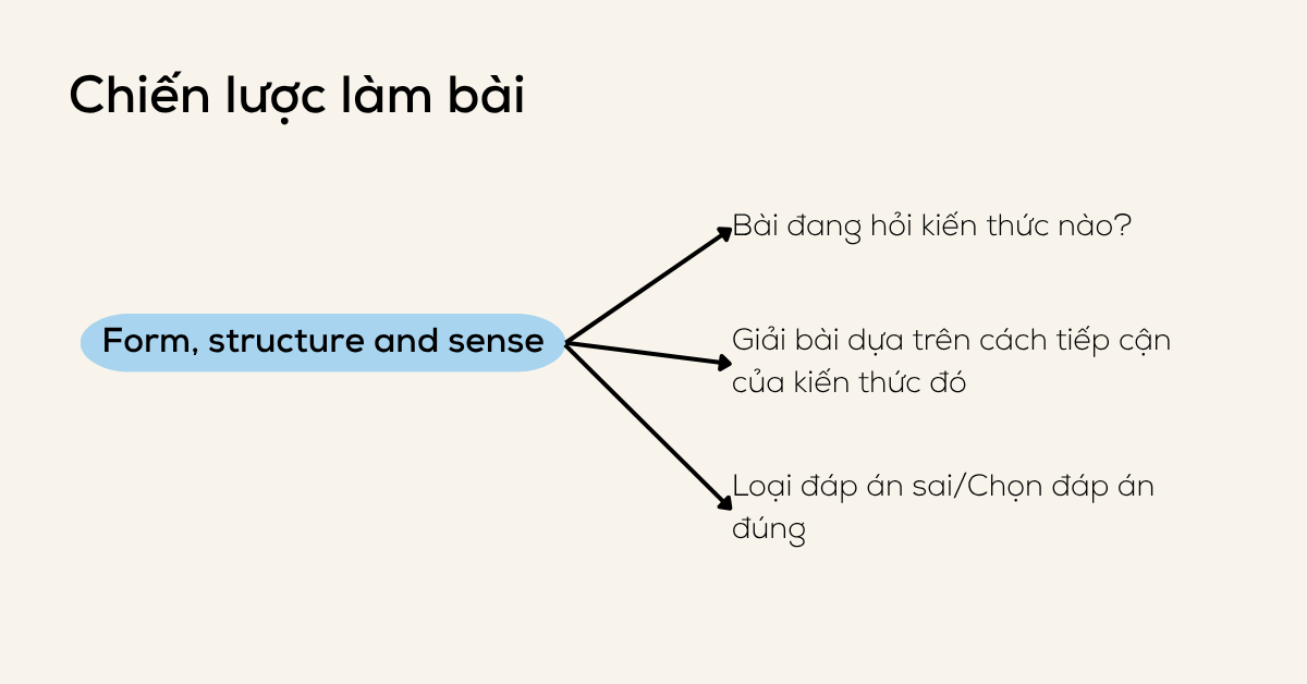 Việc này giúp tối ưu hóa quản lý thời gian và khiến thí sinh không bị tốn thời gian dịch câu hoặc hoang mang không cần thiết. Sau đó thí sinh phân tích cấu trúc câu và đưa ra đáp án phù hợp