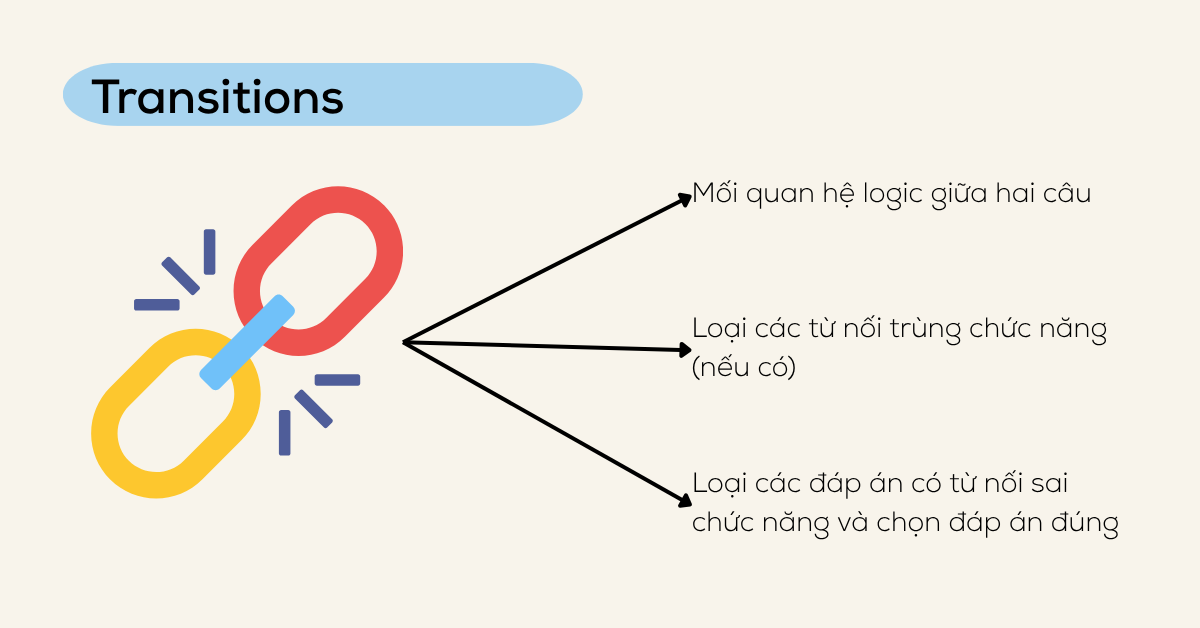 Với dạng bài Transitions, dạng bài này yêu cầu thí sinh hiểu rõ về mối quan hệ giữa câu trước và câu sau trong một đoạn văn. Vì vậy, thí sinh với dạng bài này không cần phải đọc hết cả đoạn văn mà chỉ cần đọc câu văn chứa ô trống và câu liền trước vì với từ nối (linking words), dù từ nối đó nằm ở vị trí nào trong câu - dù là ở đầu câu, cuối câu, hay giữa câu - thì đều thể hiện mối quan hệ của từ đó với câu trước.