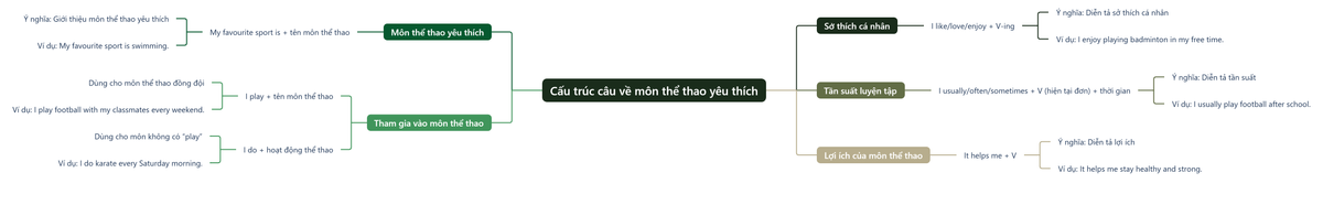 Phần dưới đây giới thiệu một số mẫu câu cơ bản và thường dùng trong chủ đề “Favourite Sport”, giúp học sinh lớp 6 biết cách bày tỏ sở thích, thói quen và cảm nhận cá nhân về môn thể thao yêu thích một cách tự nhiên và hiệu quả.
